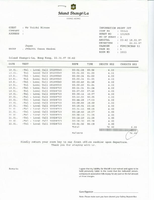 香港のホテルからの請求書